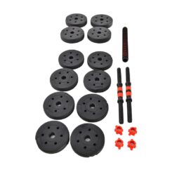 – 2 Mancuernas a rosca con topes – 1 Barra / encastre a rosca – 4 Discos de 1,25 kilos – 4 Discos de 1,5…